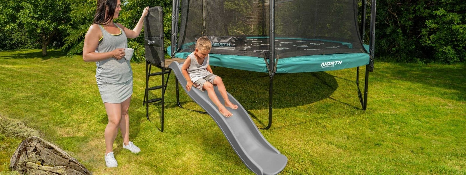 The North Base makes it easy to get up onto the trampoline. If you choose the slide, it makes coming down super fun! The base is equipped with a handy pouch which can be used to store keys, phones, etc. when you jump.